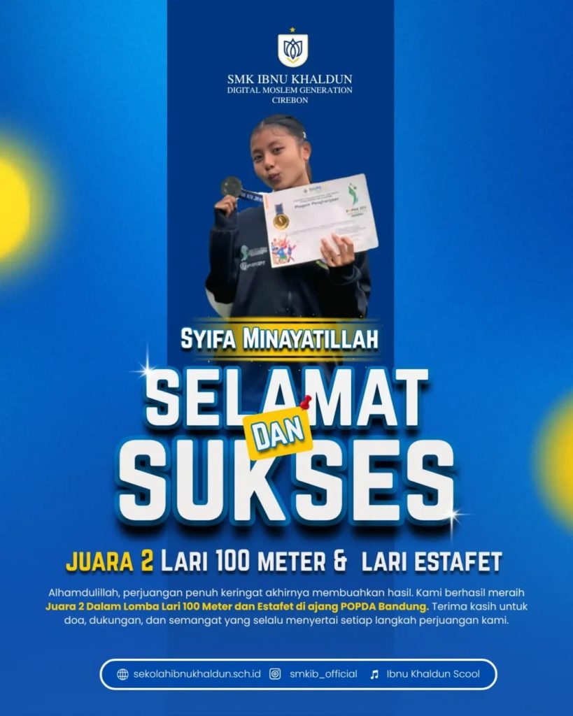 Setiap perjalanan menuju kesuksesan berawal dari tekad kuat dan kerja keras tanpa henti. Syifa Minayatillah, siswi berprestasi dari SMK Ibnu Khaldun Cirebon, membuktikan hal itu dengan mengharumkan nama sekolah lewat raihan Juara 2 Lari 100 Meter dan Lari Estafet di ajang POPDA Bandung.